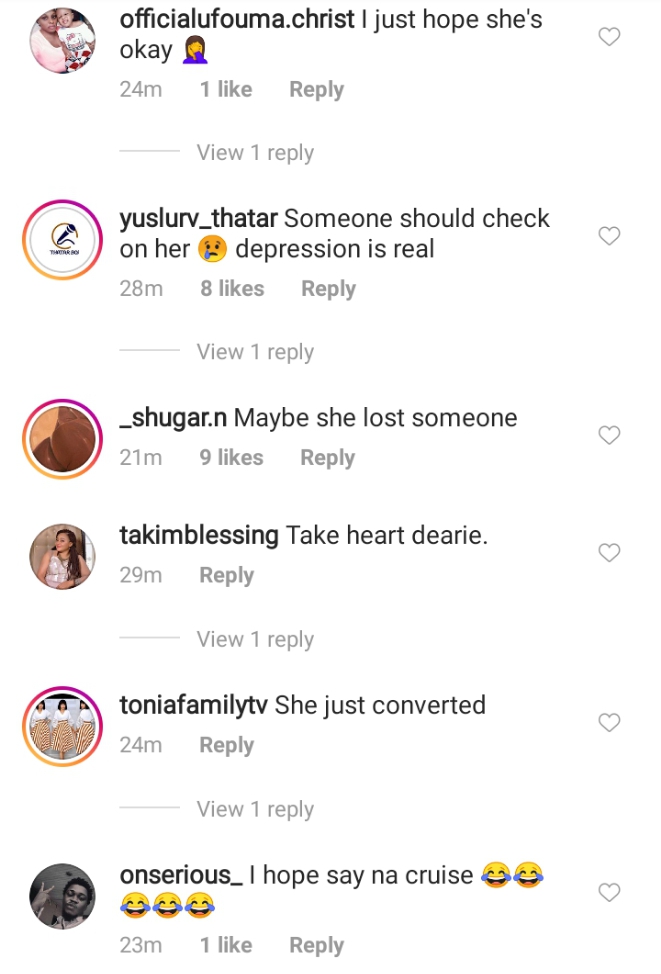 An Instagram follower @Yursluv wrote, “Someone should check on her. Depression is real.”