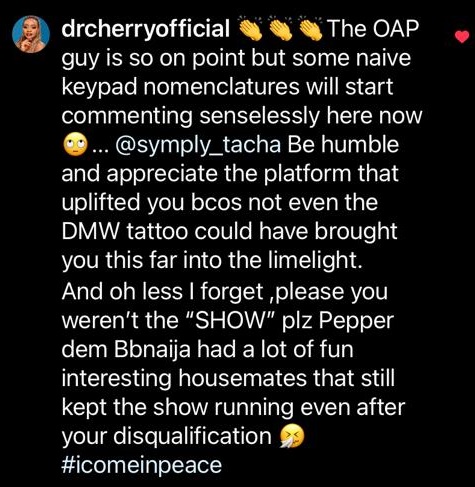 @symply tacha Be humble and appreciate the platform that uplifted you bcos not even the DMW tattoo could have brought you this far into the limelight. And oh less I forget ,please you weren’t the “SHOW” plz Pepper dem Bbnaija had a lot of fun interesting housemates that still kept the show running even after your disqualification #icomeinpeace