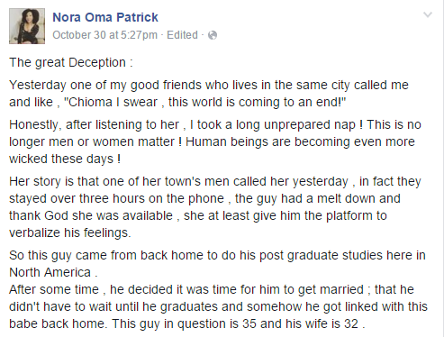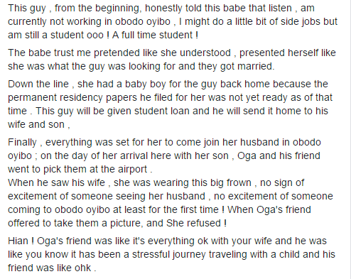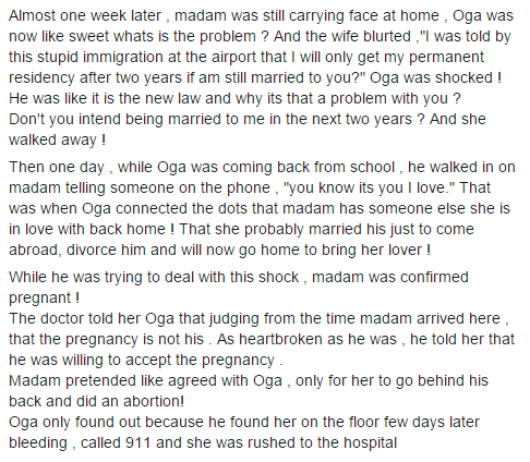 Home Life & Style How A Nigerian Man Was Almost Ruined By Woman He Took To... How A Nigerian Man Was Almost Ruined By Woman He Took To U.S.A. By Michael Badejoko - November 2, 2015 A woman on Facebook narrated in length how a woman used a guy who married her and took her abroad. She, according to the narrator, pretended to be in love with him and actually was pregnant for another man. Read the lengthy story below: Share this:FacebookX RELATED ARTICLESMORE FROM AUTHOR “If you’re rich, do not marry the poor” – Writer, Praise George advises These pieces of clothes constantly betray women I stand with Pete Edochie, kneeling down to propose to a woman is “Un-African”- Kanayo O. Kanoyo says “I cant marry a poor man, is a symptom of poverty” – Reno Omokiri shades women Checkout these stunning photos from an interracial marriage in Port Harcourt Drone photos reveal the devastating scale of the Notre Dame Cathedral fire Leave a ReplyCancel reply ADVERTISEMENT Entertainment News “It’s disheartening to see many women accepting being side chicks” –... Entertainment News “I discouraged him at first” – Sydney Talker on Carter Efe’s... Entertainment News “Detty December is not worth the risk” – Oyemykke warns Nigerians... Entertainment News Lagos State Police arrǝst 20-year-old content creator Peller over rǝckless driving... Entertainment News “Peller knelt down to beg Jarvis after surviving car cr@sh” –... Entertainment News