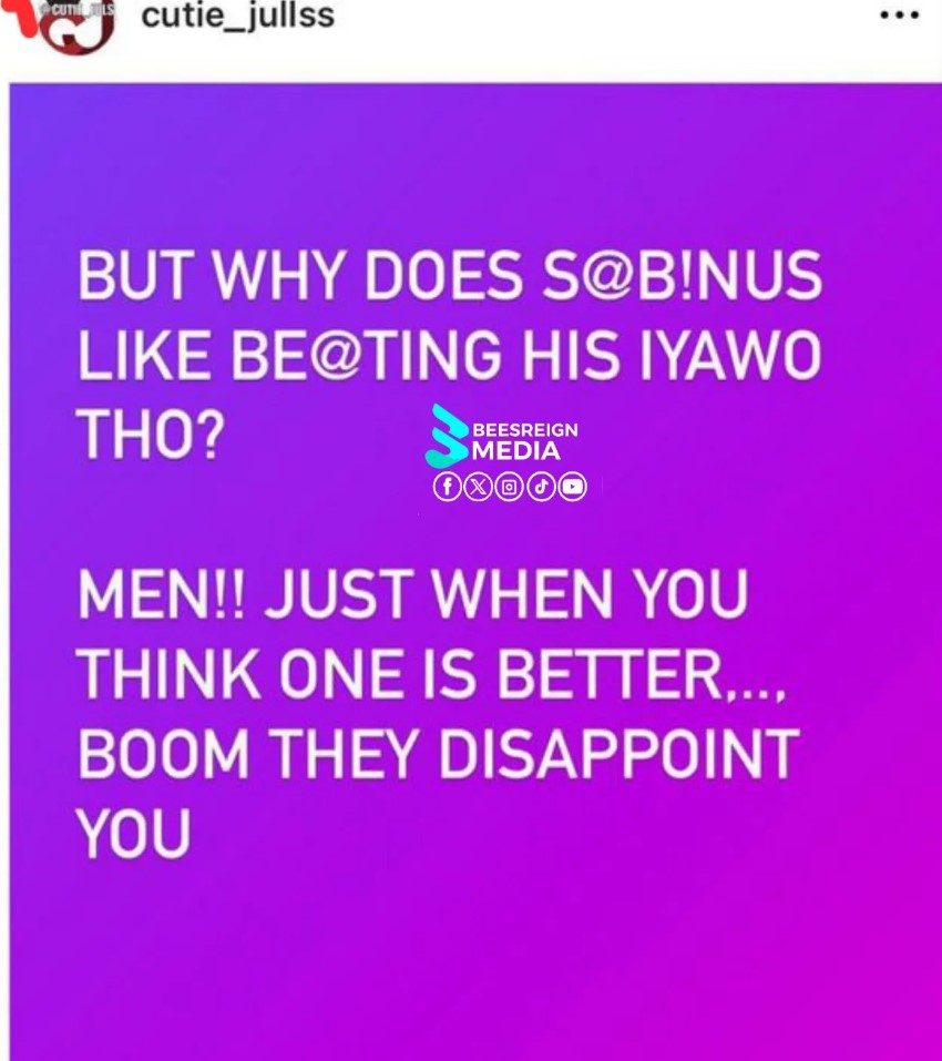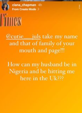 “Cutie Jules, just take my name and that of my family off your mouth and page. How can my husband be in Nigeria and be hitting me here in the UK?”