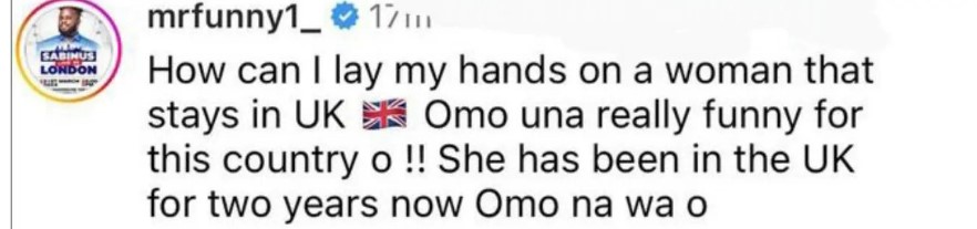 “How can I lay my hands on a woman that stays in UK. Omo una really funny for this country o! She has been in the UK for two years now. Omo na wa o.”
