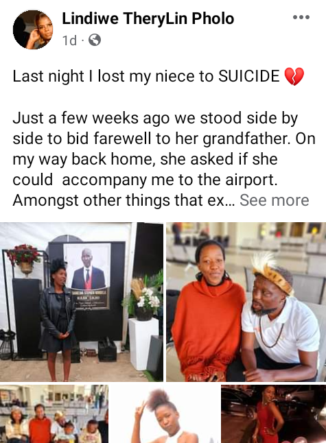 A South African lady identified as Lindiwe TheryLin Pholo, has taken to social media to mourn her niece, Khanyisile Nondela, who committed suicide.