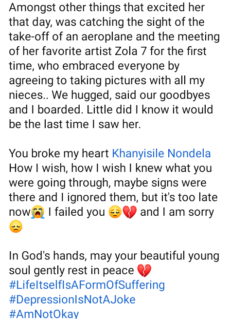 You broke my heart Khanyisile Nondela, How I wish, how I wish I knew what you were going through, maybe signs were there and I ignored them, but it’s too late now. I failed you and I am sorry. In God’s hands, may your beautiful young soul gently rest in peace.”