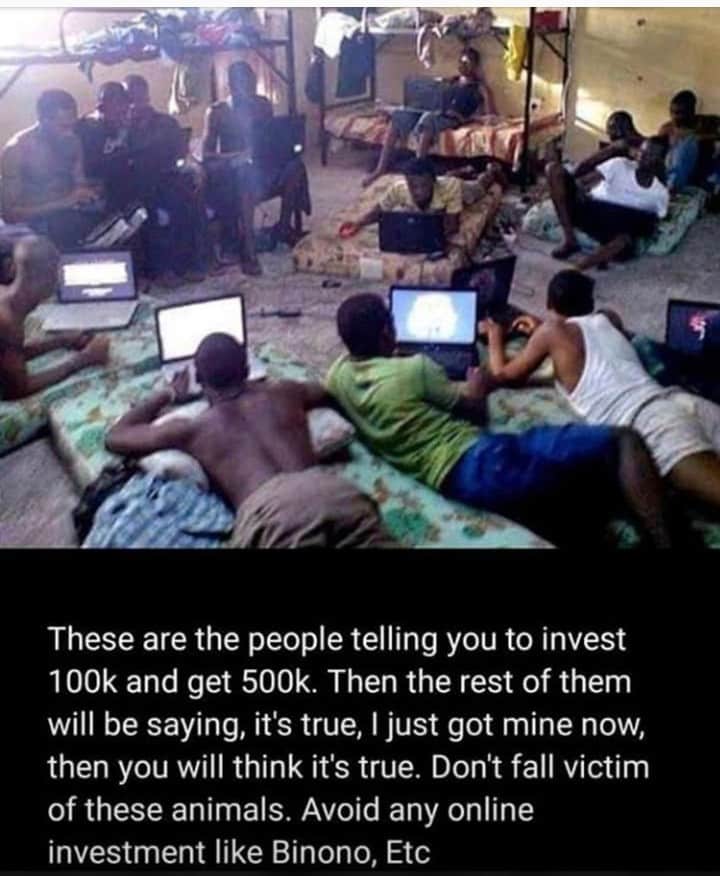 “Please what’s Binono Business! From all indications scammers capitalize on greed to get you off your hard earned sweat! Whoever is offering you 500k on investment of 100k is definitely a scammer! Even Banks and other financial institutions won’t give you such turnover …….I remember how one of my friends introduced Ponzi or whatever scheme to me then, she told me I will have X2 of any amount I invest….I told my friend that my grandmother had warned me early enough that “Ole lo n so ogun di ogoji”. (Only a thief thinks of free money doubling) you can only work hard to get your money doubled, not just giving to someone and expect it in double! Odikwa risky!!! Upon all my advice to her not to invest, she went ahead and committed all her life savings of almost 5M to the scheme! You want to know what happened!? Your guess is as good as mine…. till now she hasn’t recovered! It’s better I have my hard earned money with me than to commit it to a doomed adventure… Let’s all be careful of money doublers so we don’t fall victim! Scammers are real!!!!”