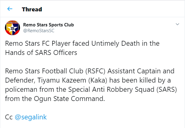 Tiyamu ‘Kaka’ Kazeem, the assistant captain of Remo Stars Football Club (RSFC) has allegedly been killed by a policeman from the Special Anti Robbery Squad (SARS) from the Ogun State Command.