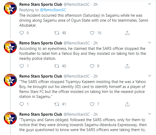 According to a statement released by his club, Kazeem ran into SARS operatives who then labelled as a ‘yahoo boy’ despite presenting his identity (ID) card to identify himself as a player of Remo Stars FC.