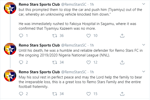 The club said the two players were then ordered by SARS operatives to follow them to the nearest police station in Sagamu. According to the club, While on their way to the station, Tiyamiyu and Sanni decided to question the SARS officers were taking them to, prompting them to stop the vehicle and then pushed Tiyamiyu out whereby an unknowing vehicle knocked him down.