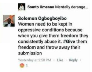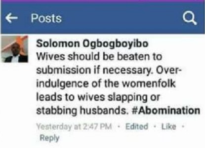 Identified on Facebook as Solomon Ogbogboyibo, He took to the platform to advise men to ensure they subdue their wives because if women are given freedom they will abuse it.