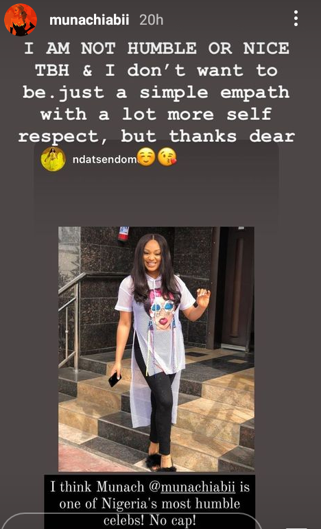 Ex-beauty queen and actress, Munachi Abii, has revealed that she is neither humble nor nice, in reaction to a fan’s compliment.