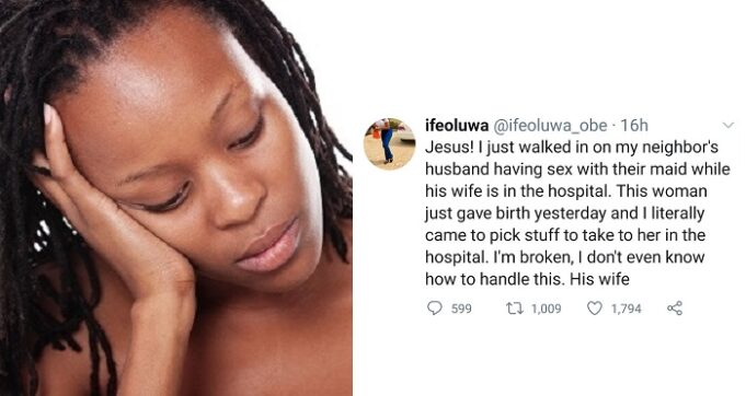 A man was nabbed having sex with his maid only moments after his wife put to bed and was in the hospital recovering, a Twitter user tells.