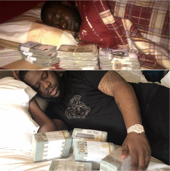 Malaysian-Based Nigerian Big Boy, Ray Hushpuppi has shared a throwback photo of himself when he used to sleep with a million naira in 2010… and then also compared it with a 2017 photo where he “slept” with Half a Million Dollars.
