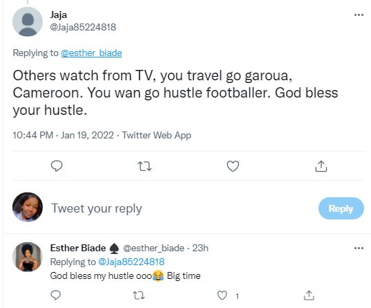 Big Brother Naija star, Esther Biade, has been trolled on Twitter for going to Cameroon to watch the ongoing African Cup of Nations, AFCON, Games live.