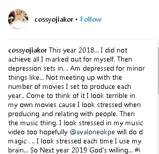 Nollywood actress, Cossy Ojiakor has opened up on her battle with depression in the year 2018 and how it has affected her career so far.