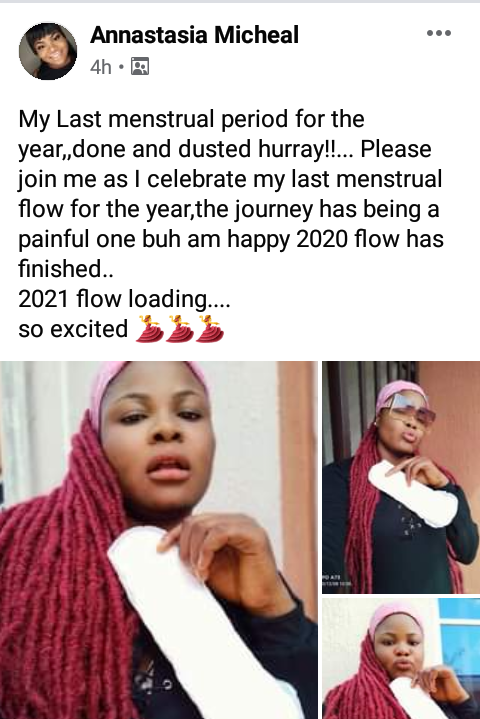 A young lady from Enugu State identified as Anastasia Michael has gone viral on social media after she took to a Facebook group to celebrate her last menstrual period for the year.
