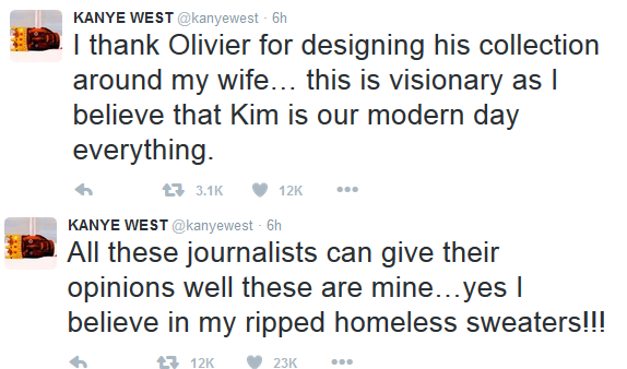 The rapper also called his wife, “our modern day everything“. He said there are so many fake friends in the fashion world and wants people to know he loves his ripped homeless sweaters.
