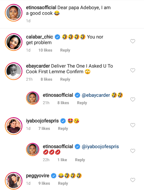 Actress, Etinosa has told the general overseer of the Redeemed Christian Church Of God, Pastor Enoch Adeboye that she can cook very well.