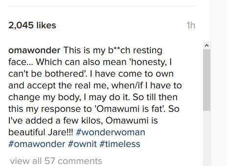 This is my b**ch resting face… Which can also mean ‘honesty, I can’t be bothered’. I have come to own and accept the real me, when/if I have to change my body, I may do it. So till then this my response to ‘Omawumi is fat’. So I’ve added a few kilos, Omawumi is beautiful Jare!!! #wonderwoman #omawonder #ownit #timeless