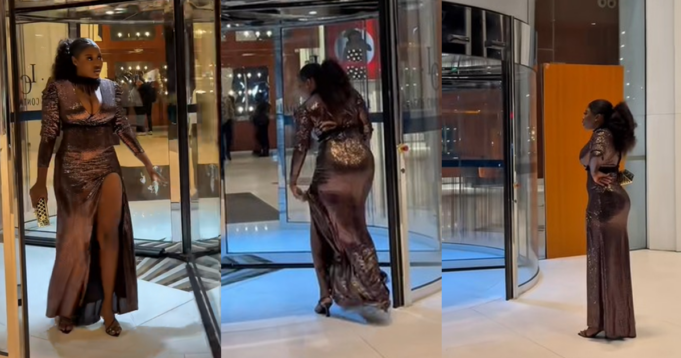In the clip, a lady struggles to exit a 5-star restaurant as she tries to navigate a revolving door. Overcome with anxiety, she hurriedly approaches the door, which causes her to become disoriented.