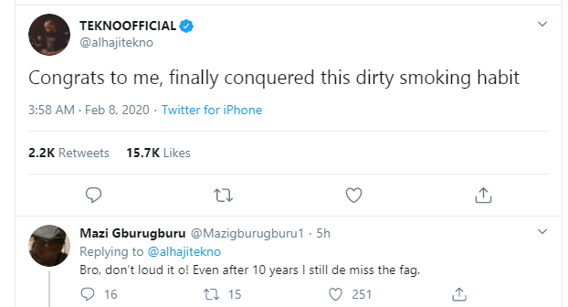 Nigerian singer, Tekno has announced that he has quit smoking which he described as a “dirty habit”.
