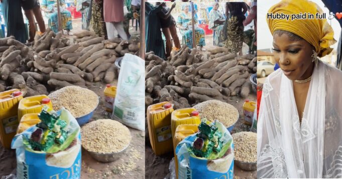 Basins of beans, bags of rice, palm oil and other assorted foodstuff were included in the package to the surprise of viewers and glee of the bride and her family.