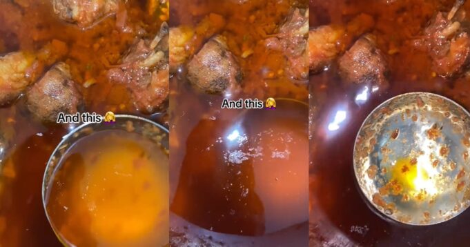 In the caption, the woman @preciousdesmond revealed the excess oil in the pepper stew her husband prepared and captioned, “I gave my husband a chance in the kitchen.”