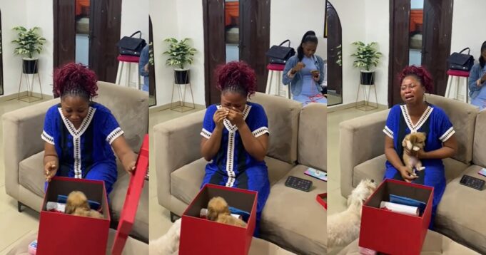 She was moved to tears by the considerate birthday surprise and gave the puppy a tender embrace before her friend joined them to console her.
