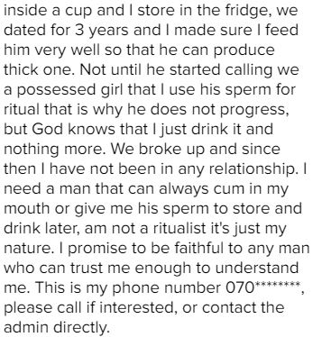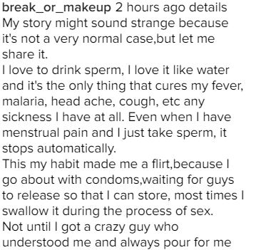 The young woman shared her rather unbelievable tale on social media telling her stunned audience about her obsession with sperm.