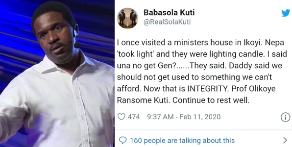 “I once visited a ministers house in Ikoyi. Nepa ‘took light’ and they were lighting candle. I said una no get Gen?……They said. Daddy said we should not get used to something we can’t afford. Now that is INTEGRITY. Prof Olikoye Ransome Kuti. Continue to rest well.” he tweeted.