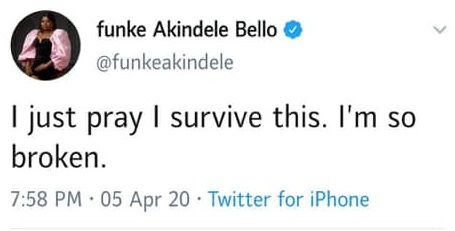 However after her arrest, Funke wrote in a tweet she posted by 7:58pm;