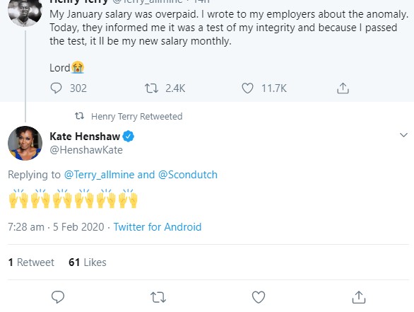 “My January salary was overpaid. I wrote to my employers about the anomaly. Today, they informed me it was a test of my integrity and because I passed the test, it ll be my new salary monthly. Lord.”