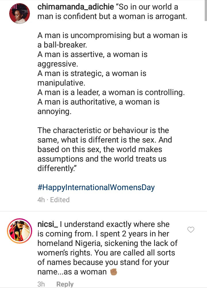 She said this while responding to Chimamanda Ngozi Adichie’s Instagram post on International Women’s Day.