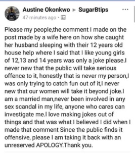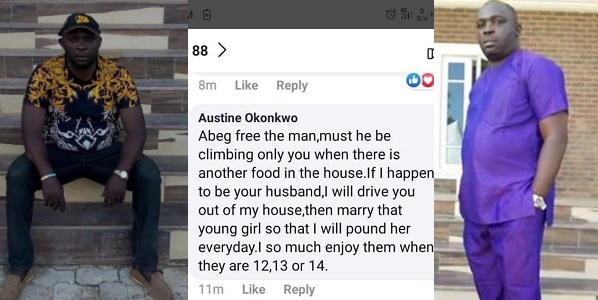 The Nigerian man had earlier revealed his bizarre love for underaged girls while commenting on a Facebook post in which a woman who allegedly caught her husband sleeping with her 12-year-old niece sought for advice.