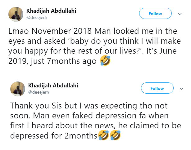 She tweeted: “I wasted 6years of my life on this bastard only for me to see his wedding IV on Instagram. Man is getting married on 14th July!! Lmao he blocked me sharp sharp on WhatsApp and I returned the favor! Men! Men!! Men!!! Allah ya isa.”
