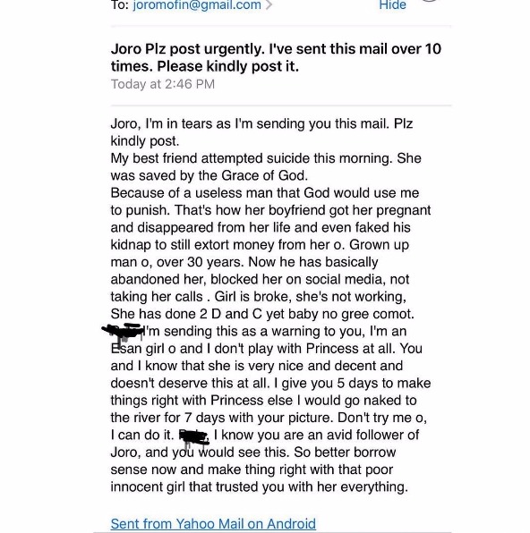 She wrote to relationship expert, Joro Olumofin, to call out the alleged man who according to the lady is an Avid follower of Joro.