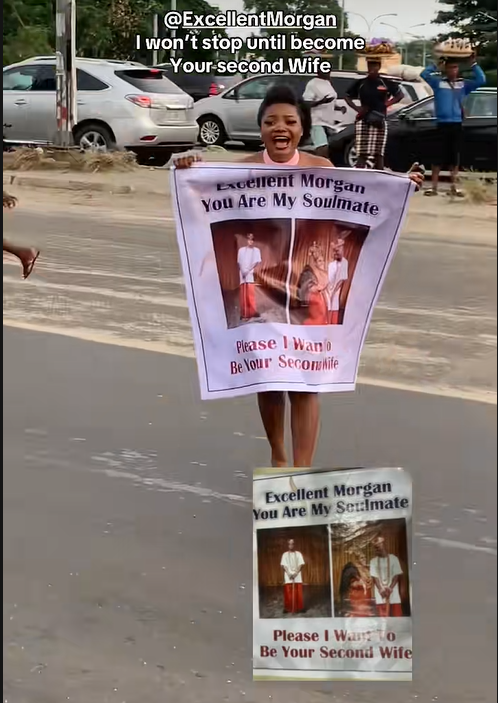 In the video which she posted on TikTok, she is seen roaming the streets and the markets, holding a banner with the man’s photo printed on it. Inscribe on the banner is “Excellent Morgan you are my soulmate. Please I want to be your second wife”.