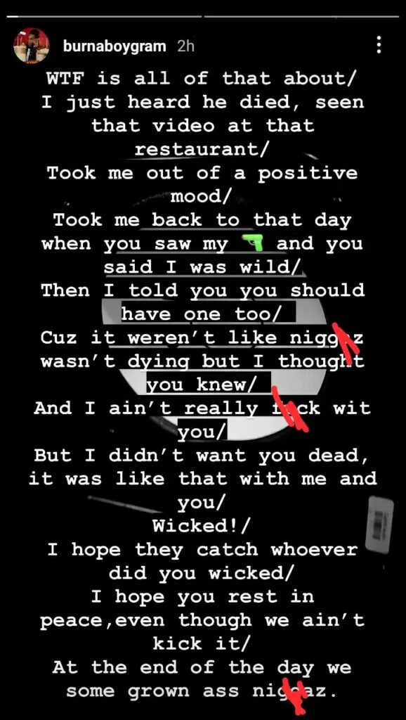 Taking to his Instastory, Burna Boy, who collaborated with AKA on a song titled “All eyes on Me” in 2014, penned an emotional tribute to him.