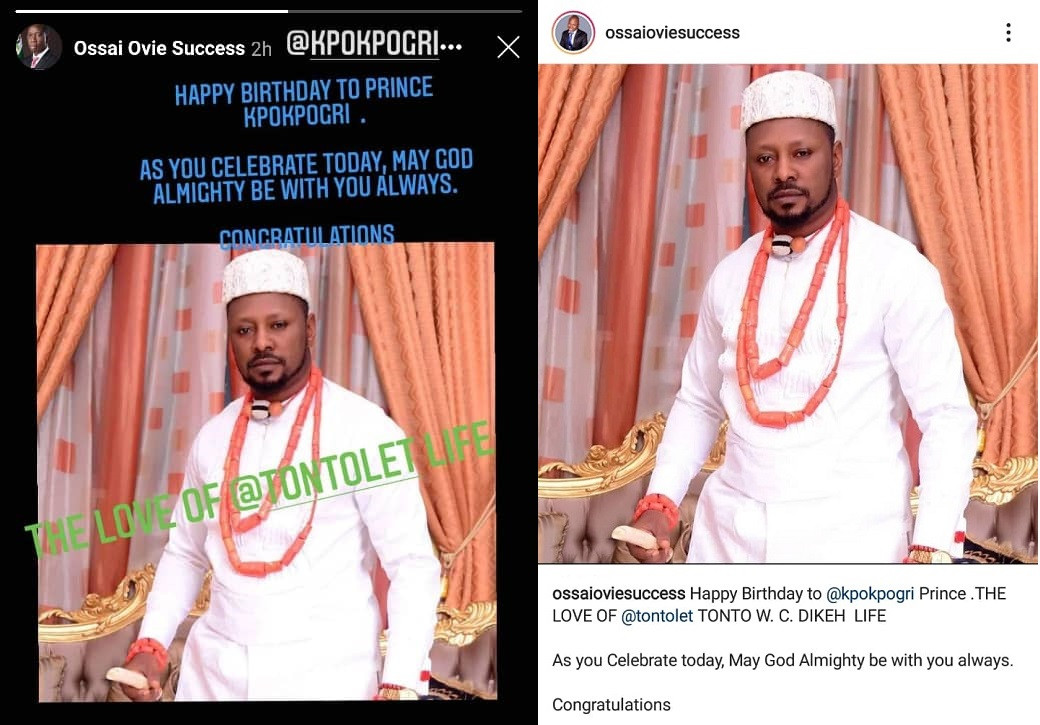 He wrote in his caption: “Happy Birthday to @kpokpogri Prince. THE LOVE OF @tontolet TONTO W. C. DIKEH LIFE. As you Celebrate today, May God Almighty be with you always. Congratulations.”