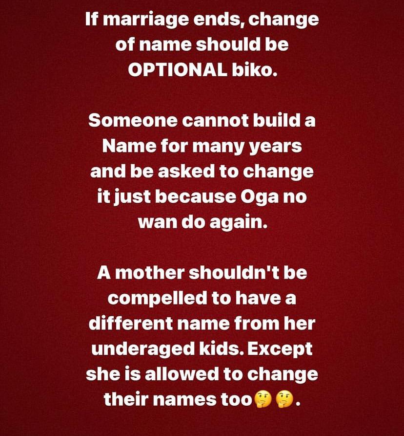 If marriage ends, change of name should be OPTIONAL biko. Someone cannot build a Name for many years and be asked to change it just because Oga no wan do again. A mother shouldn’t be compelled to have a different name from her underaged kids. Except she is allowed to change their names too.