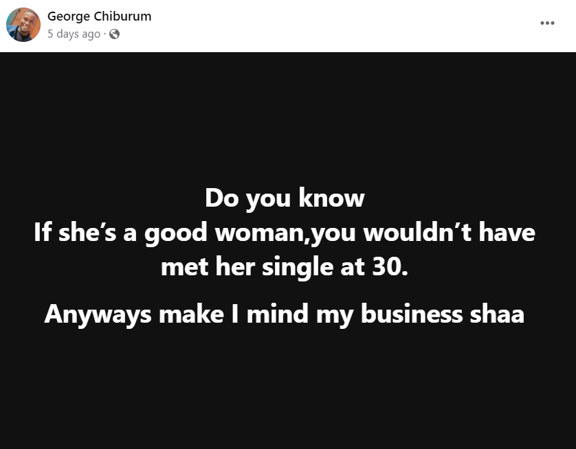 A Nigerian man, George Chiburum on his Facebook account, shares his sentiment on unmarried females at the age of thirty years and above.