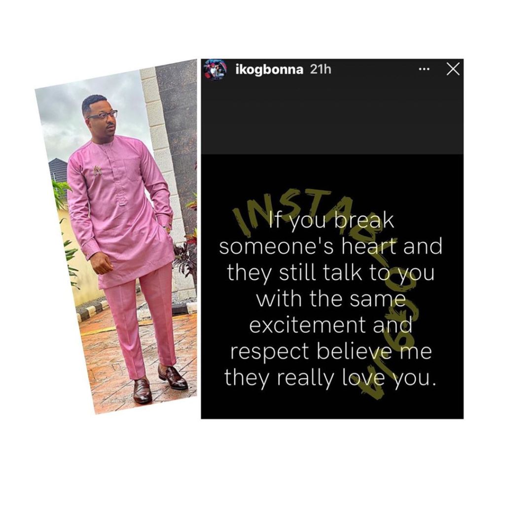 IK Ogbonna cited on his Instagram page that one can know how much his partner loves him or her when the partner still talks to them after giving him or her a broken heart.