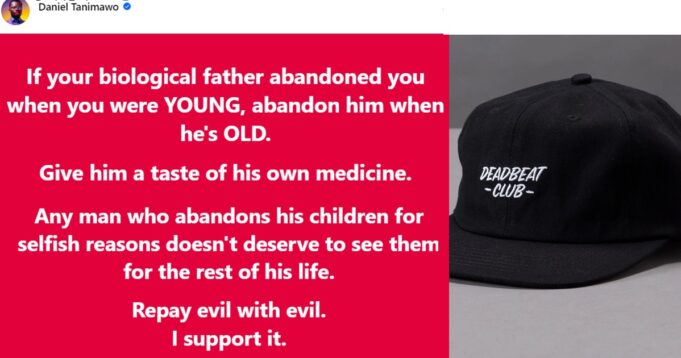 A US-based Nigerian software engineer and Facebook influencer, Daniel Tanimawo addressed his audience on how to treat deadbeat and absent fathers.