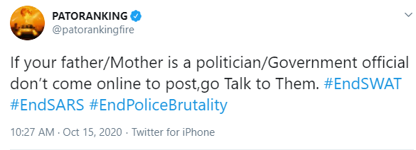 ”If your father/Mother is a politician/Government official don’t come online to post,go Talk to Them. #EndSWAT #EndSARS #EndPoliceBrutality”