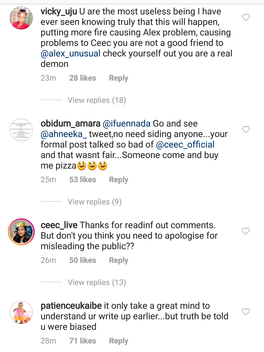 Ifu Ennada came under fire last night after she penned down what she said was a call for peace between fellow ex-housemates, Cee-C and Alex.