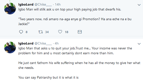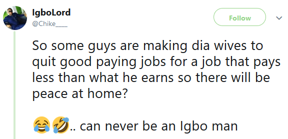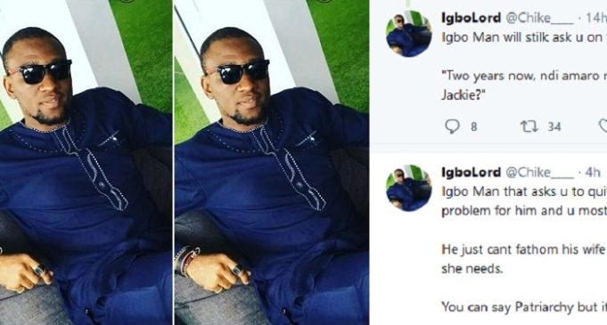 The man, identified simply as Chike believes an Igbo man can never ask his wife to leave a job that is bringing more money to their home.
