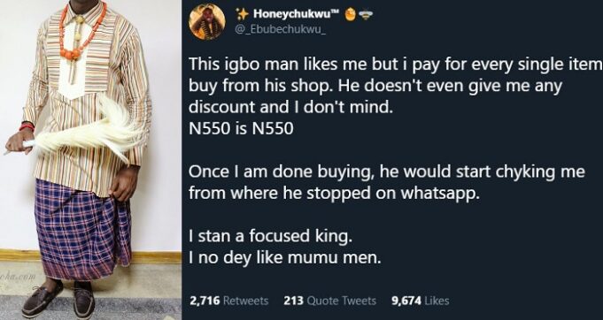 A Nigerian lady with the name, Ebubechukwu, has taken to Twitter to praise an Igbo man who though is making advances at her, won’t let his feelings disrupt his retail transactions with her.