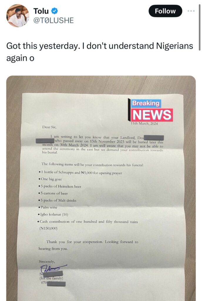 The X user, identified as @T0LUSHE, disclosed that he received a letter containing a list of items he is to contribute towards the funeral of his late landlord.