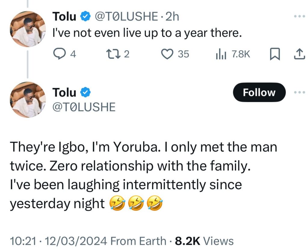 They’re Igbo, I’m Yoruba. I only met the man twice. Zero relationship with the family.