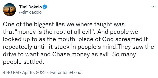 Sensational Nigerian singer, Timi Dakolo, has opined that the maxim “money is the root of all evil” is the biggest lie people were taught.