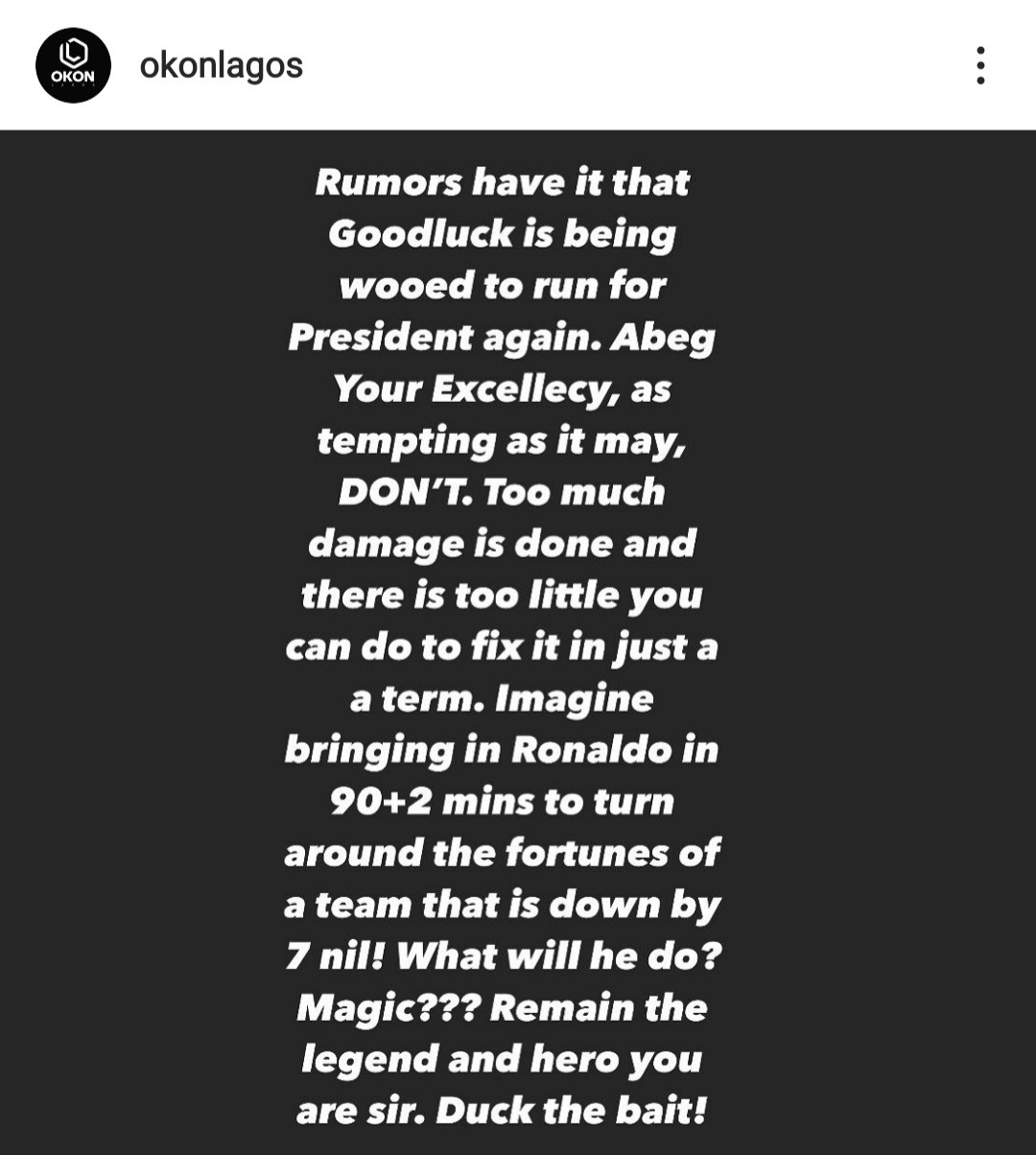 “Rumors have it that Goodluck is being wooed to run for president again. Abeg your excellency, as tempting as it may, Dont. Too much damage is done and there is too little you can do to fix it in just a term. Imagine bringing in Ronaldo in 90+2 mins to turn around the fortunes of a team that is down by 7 nil! What will he do? Magic?? Remain the legend and hero you are sir. Duck the bait!”