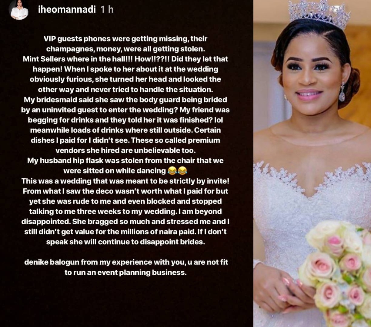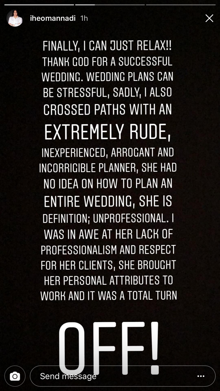 According to Iheoma, the wedding planner, Nike Balogun popularly known as Diamonk Ink Events, was extremely rude, arrogant, unprofessional and incorrigible throughout the planning process.